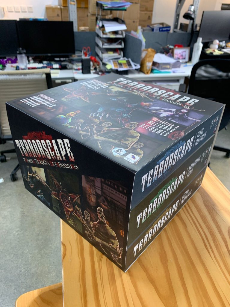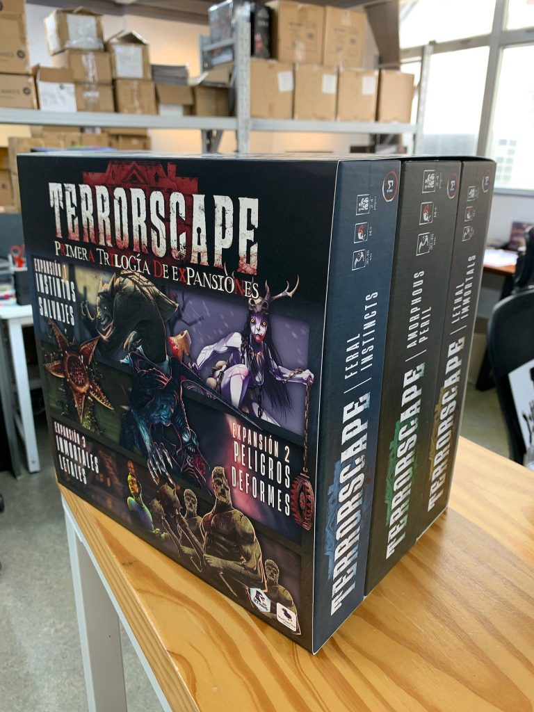 Para la Trilogía, hemos creado un forro especial que acoja a las 3 cajas independientes. No queríamos prescindir de nada de lo que traen las expansiones originales al agruparlas en una única caja, y gracias a esta solución creo que cubrimos todas las opciones: un agrupamiento fácil y muy vistoso, manteniendo la independencia de la caja de cada expansión con todos sus insertos personalizados.