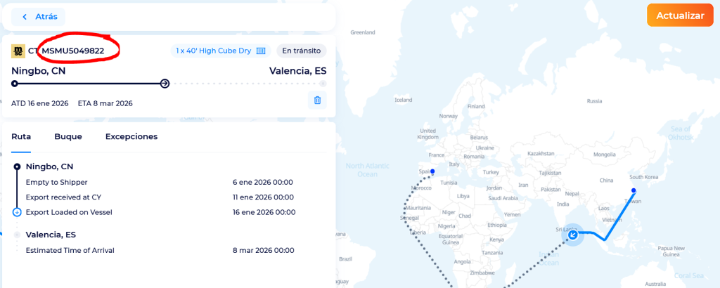 Si queréis hacer seguimiento del barco en tiempo real, podéis hacerlo usando por ejemplo la seb Searates y el número de contenedor MSMU5049822