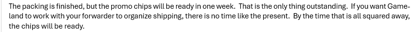Lo que nos comentaron fue esto. Que todo estaba empaquetado, pero que los chips promo de Deslandra aún tardarían una semana, al menos.