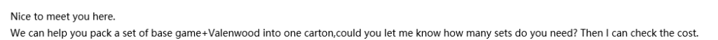Hará cuestión de meses que solicitamos que, para facilitar al máximo el envío de una cantidad enorme de pedidos, que empaquetasen juntos juego + expansión valenwood (esto es algo que creo los propios de CTG han hecho ya que la caja contenedora era básicamente la misma y la verdad que a efectos de manipulación, protección y gestión es muchísimo mejor).