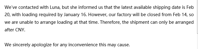 Aquí también nos dijeron que creían que serían capaces de cargar ambas oleadas antes del Año Nuevo Chino, pero nosotros ya sabíamos que no. Si lograr que cargasen la oleada 1 ya iba a estar apretado, ni en broma llegábamos a cargar las 2.