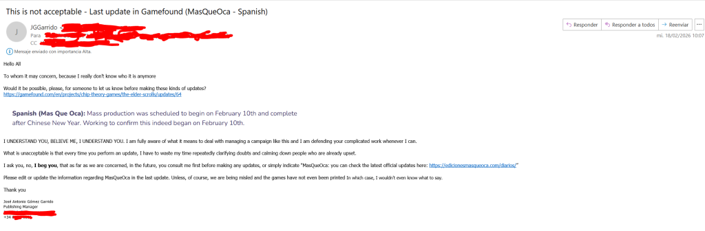 De verdad que tocada de cojones cada vez que hacen una actualización sin tener en cuenta como tiene cada editorial sus avances reales. Que no os hagan un chequeo editorial por editorial siendo 12 entiendo que es un jaleo pero que no enlacen a las actualizaciones de los que llevais todo explicado, de verdad que no lo entiendo y me cabrea un montón la desinformación y vapuleo posterior a la editorial y a ti personalmente que generan. Espero que siga CTG lo que les pides en el mail. Mil gracias por compartir y poner transparencia . Es mi primerito Gamefound. Con vosotros seguiré entrando en más.